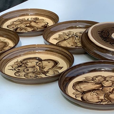 Savitorpan lautaset ja mukit. 6kpl mukeja ja 6kpl lautasia. Muki korkeus 8cm, halkaisija 8.5cm. Lautasen halkaisija 14cm. Kaikki erittäin hyvässä kunnossa. Nouto onnistuu Porvoon Peippolasta.