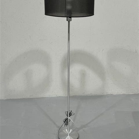 Kromijalkainen, tukeva jalkavalaisin. Katkaisin lampun varressa, korkea koristeellinen varjostin