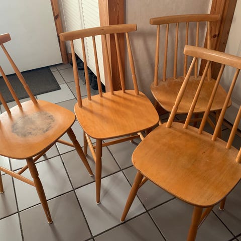 Kuvan mukaiset tuolit. Kaipaa vähän liimaa tai jotain. Yhden tuolin alle joku joskus laittanut ruuveja. Tarjouksia myös kuunnellaan kunhan pääsevät uuteen kotiin. Vain nouto
