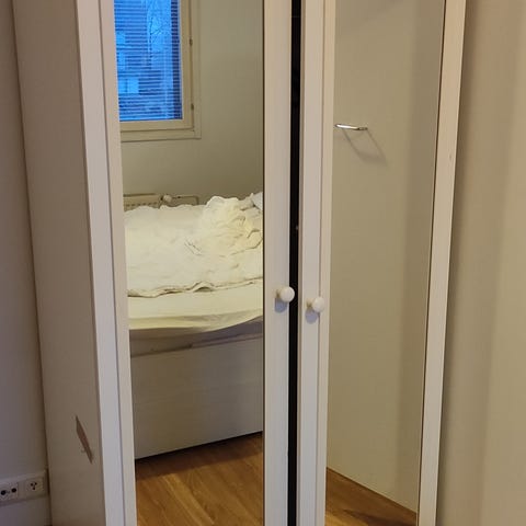Annetaan uudenveroinen Brimnes-vaatekaappi. Toisella seinällä peili kiinnitetty ja tulee kaapin mukana. Kaapin sisällö tanko ja hyllyjä. Kaappi täytyy noutaa ja kantaa itse ulos.