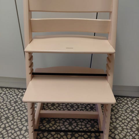 Hyväkuntoinen syöttötuoli kaikilla varusteilla! Tuoli muuttuu lapsen kasvaessa juniortuoliksi, kun istuinosaa ja jalkatukea säätää alemmas.
