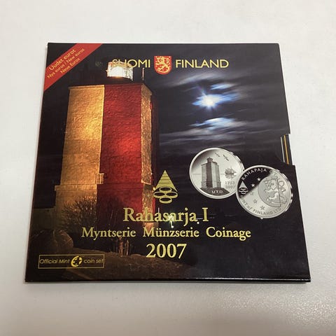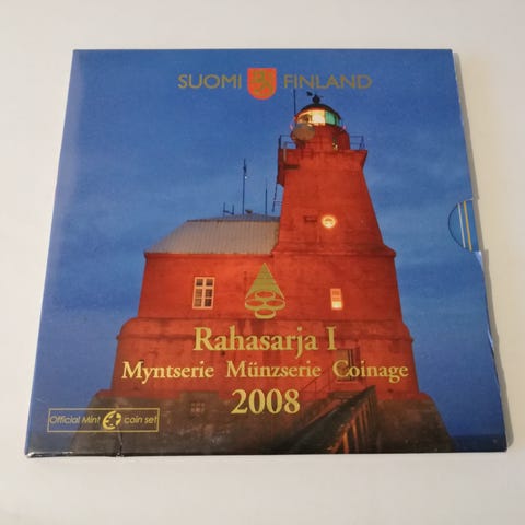 Rahasarja 2008/I Porkkalan majakka Suomi. Vuosilajitelma sisältää kaikki Suomen kahdeksan eurokolikko leimakiiltoisina, yhdestä sentistä kahteen euroon.