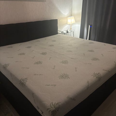 Puurunkoinen sänky kiinteällä sängynpäädyllä (korkeus n. 120cm). Joustinpatkat ja wellpur petauspatja. Sänky ostettu Koti-silistä ja petari Jyskistä. Nouto Kuopion keskustasta.