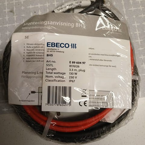 3 kpl betonin kovetuskaapeli, pituus 35 metriä, jännite 230 volttia, teho 1400 wattia, suojausluokka IP67. Soveltuu betonin kovettumisen lämmitykseen.