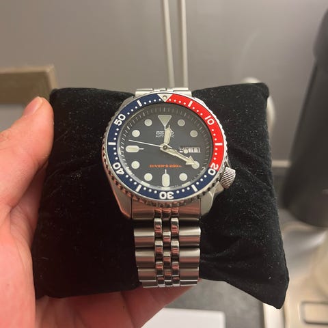 Seikon ikoninen "Pepsi" SKX009 japanin versio. Japanin versiossa on taulussa "21 JEWELS", "MADE IN JAPAN" ja tummempi tausta. Tämä on harvinaisempi kuin K-versio. Full set 08/2021. Kello erittäin hyvässä kunnossa, hyvin hentoa jälkeä claspissa, mutta muuta huomautettavaa ei ole. Mukaan Seikon ikonisen jubilee rannekkeen lisäksi alkuperäinen muoviranneke, joka näyttää käyttämättömältä. Ranneke lyhennetty 18cm ranteelle, mukaan jatkopalat.
