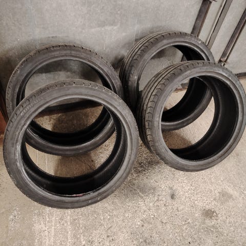 Myydään Triangle EffeXSport 235/45R19 99W kesärenkaat. Valmistettu 45/23, kahdessa pintaa keskellä n.4mm, kahdessa 2.5-3mm. Reunoilta enemmän kuluneet. Asennus onnistuu myös.