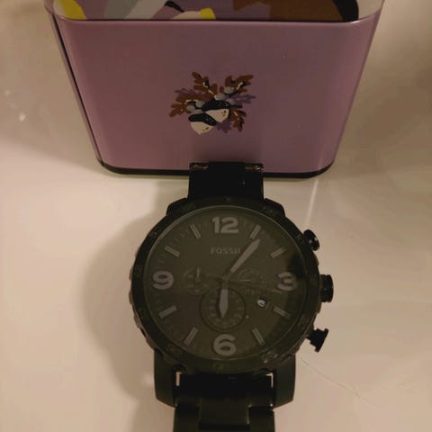 Fossil miesten rannekello, jossa musta kellotaulu ja nahkaranneke. Kello on varustettu kronografitoiminnoilla ja päivämääränäytöllä. Rannekkeen sisäpinta on ruskea nahkaa ja ulko mustana.
