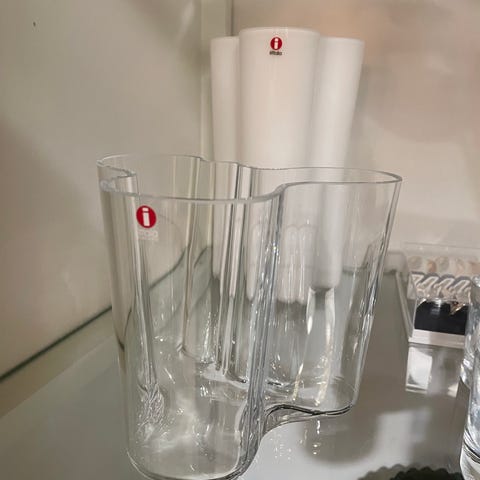Iittala Aalto maljakko kirkasta lasia. Tunnettu aaltoilevasta muotoilustaan, joka sopii erilaisiin sisustustyyleihin. Käytettävissä kukkien tai muiden koristeiden esillepanoon.