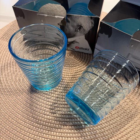 Siniharmaat Iittala Aino Aalto-juomalasit. Viisi kappaletta yhteensä 17 euroa.