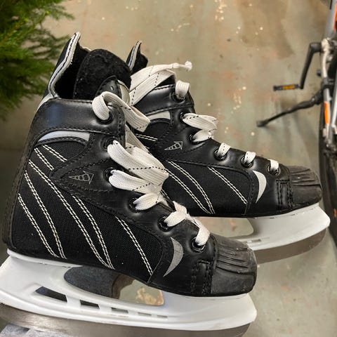 CCM Jääkiekko lasten luistimet, koko 35. Luistimet ovat mustavalkoiset, joissa on sinisiä yksityiskohtia.