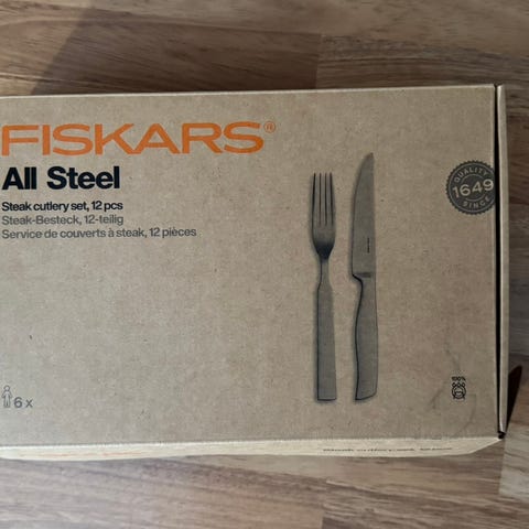 Fiskars All Steel steak-aterinsetti, joka sisältää 12 osaa. Aterimet on valmistettu teräksestä ja soveltuvat pihvin syömiseen. Setissä on 6 haarukkaa ja 6 veistä.
