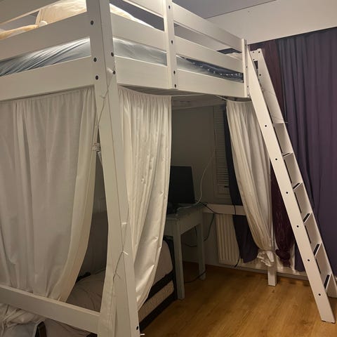 Ikea Stora parvisänky, valmistettu puusta, valkoinen väri. Kerrossänkyssä tikkaat ja suojakaiteet yläpedissä. Sopii lasten ja nuorten käyttöön. Vain muutaman kuukauden kasassa. Nyt osissa.
