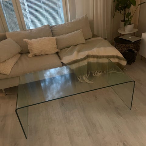 Lasinen sohvapöytä, tummaa lasia ja metallinen kehys