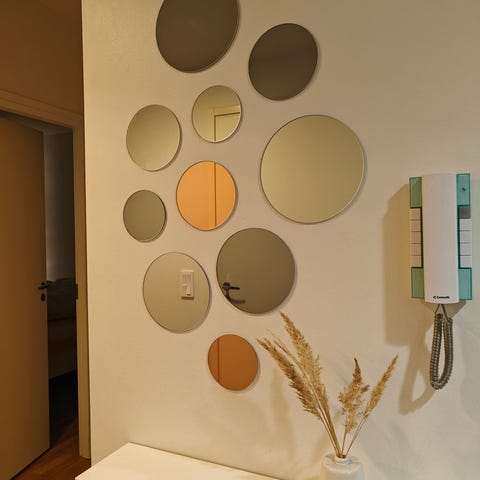 Näistä paloista koostuu yhtenäinen peili. Peileissä tarrapintaa kiinni, saa kyllä poistettua mutta jää ostajan tehtäväksi.