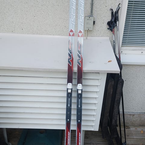 Madshus, perinteiset murtomaasukset (pit. 205 cm) NNN-siteillä ja sauvat (pit 150 cm). Olleet 176 cm/ 75 kg:n hiihtäjällä.