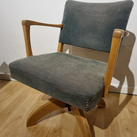 Myydään tukeva, Billnäs-henkinen tamminen nojatuoli. Tuoli on ikäisekseen hyvässä, käytetyssä kunnossa. Rakenne on ehjä, mutta pinnassa on patinaa ja kulumaa.
