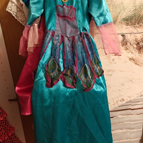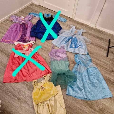 Kaksi prinsessahametta. Pinkissä kokona 140 ja turkoosissa 130, mutta tuskin mahtuu niin isolle. Näitä on suhteellisen sujuvasti pidetty jo noin koosta 100 cm alkaen. Molemmat samalla kertaa, nouto tai postitus.