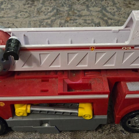 Ryhmä Hau paloauto jossa kaikki varusteet toimivat, mukaan tulee Samppa ja kuvassa näkyvä pikkupalo-auto. Vasemmassa kyljessä ”vesiletku” tallessa ja takana on ”sammutustykki”.