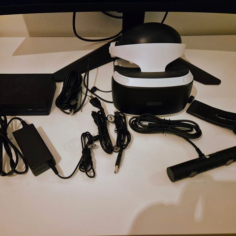 Sony PlayStation VR virtuaalitodellisuus setti sisältää VR-lasien lisäksi tarvittavat kaapelit ja lisälaitteet kuten PS4 kameran ja ohjausnoksin. Laite on suunniteltu PlayStation 4 konsolille ja tarjoaa immersiivisen pelikokemuksen virtuaalitodellisuuden avulla.