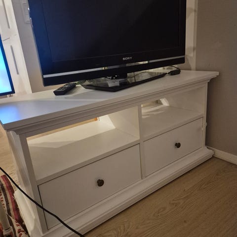 Valkoinen TV-taso laatikolla, leveys 150 cm, syvyys 45 cm, korkeus 40 cm. Huom. Laatikossa ei kiskoja.