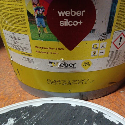 Myydään Weber Silco+ pinnoite 2mm. Sävy vaalea harmaa. Purkissa 25kg.