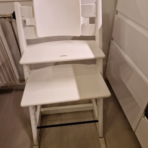 Myydään stokke tripp trapp ja siihen kuuluvat kuvassa näkyvät lisäosat. Tuolissa käytön jälkiä kts. kuvat. Pehmuste tummunut istuinosasta.