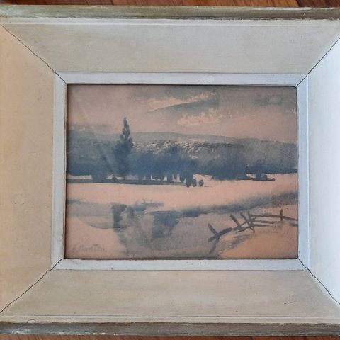 Lasitettu kehys 42,5x34,5 cm. Akvarellimaalauksen näkyvä osa 28x20 cm. Takana kaksi omistajamerkintää (peitin kuvasta), vuosilta -58 ja -88.