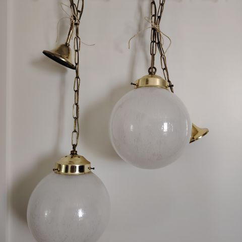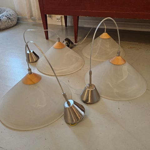 Riippuvalaisimet 4kpl. Varjostimet maitolasia. Johdon pituus n.70cm. Kanta E14. Polttimot ei kuulu kauppaan. Lasikuvuissa hieman kellertymää.