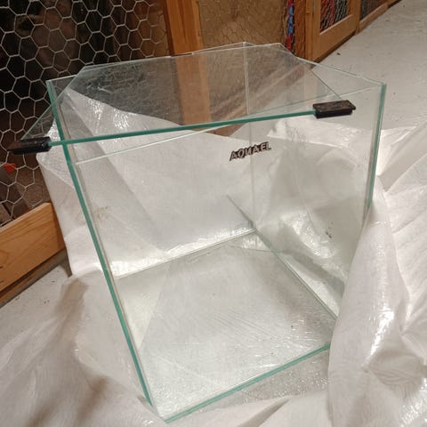 Lasinen akvaario, jossa alumiinirunko. Soveltuu kaloille tai muille eläimille. Kuvissa näkyy myös pieni halkeema, huomattu käytöstä poiston jälkee. Pieni halkeema pohjas. Sopii hyvin terraario käyttöön.