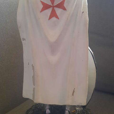 Metallinen ritaripuku koriste-esine, jossa on kypärä, kilpi ja miekka. Suunniteltu esittely- tai koristekäyttöön.