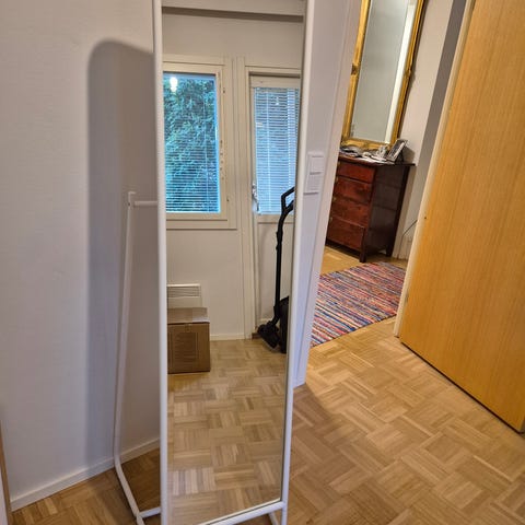IKEAn kätevä peili rekkitangolla. Peilissä on takana myös koukut. Peili on hyvässä kunnossa.