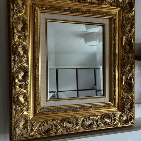 Upea kuvan seinäpeili etsii uutta kotia. Peili on ehjä. Ajan saatossa tullut patinaa. Tästä huolimatta selkeä. Kehys ehjä. Ripustin löytyy ja sitä on korjattu. Leveys ylhäältä 61 cm ja alhaalta 51 cm. Korkeus 115 cm.