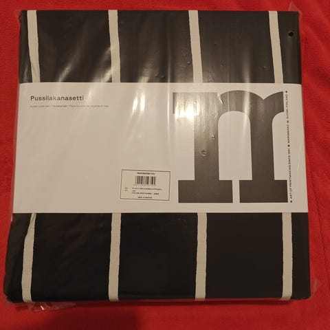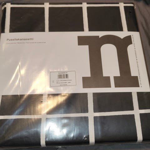 Uudet 2 kpl, vielä paketissa olevat Armi Ratian suunnittelemat mustat Tiiliskivi pussilakana setit (pussilakana 150x210 cm ja tyynynliina 50x60 cm).