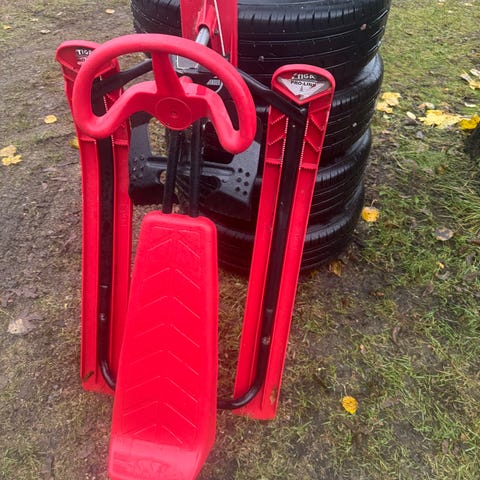 Stiga lasten potkukelkka, jossa musta ja oranssi väri. Kelkan rakenne sisältää muoviset liukupinnat ja ohjaustangon, joka on varustettu pehmustetulla kahvalla. Kelkan etuosassa on naru ohjausta ja hallintaa varten. Kelkka on muuten toimiva paitis etusuksen muovi haljennut (kts kuva 4) mikä vähän jarruttaa laskua.