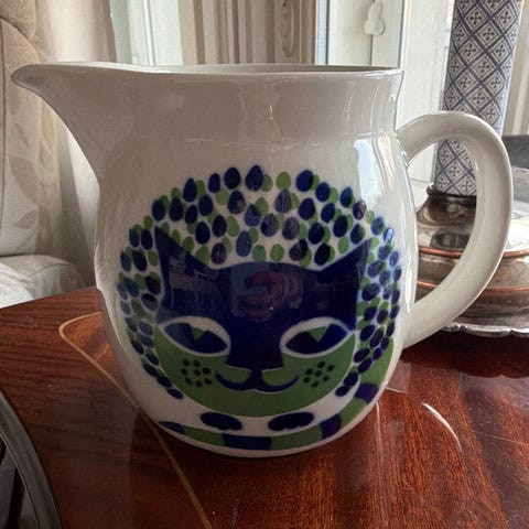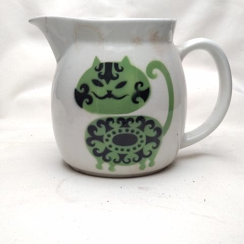 Arabian Kissa -kannu 1,0 L vihreällä koristeella, kannu kuuluu mallisarjaan KL. Kissa-koristeen on suunnitellut Gunvor Olin-Grönqvist.