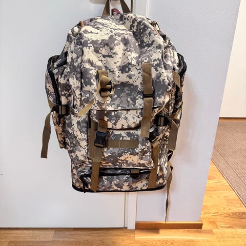Musta rinkka 80L, jossa on useita taskuja ja säädettävät olkahihnat. Yhdellä Thaimaan matkallaollut käytössä, kuin uusi.