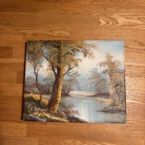 Itse tehty maalaus. Värit ovat vaaleat ja kulta. Maalattu akryyliväreillä ja käytetty koristeluun kultalehteä.