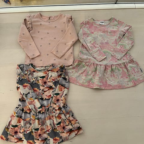 Myydään mekko- ja tunikasetti: Muumipaita 104, kukkainen Girafin mekko 110 (vastaa 98/104 kokoa), My wearin yksisarvismekko 98/104 ja hillakuvioinen Pikku hillan tunika (koko 86/92, mutta on saman kokoinen kuin muumin 104 eli vastaa 98/104 kokoa). Kaikki ovat ehjiä ja perussiistejä, mutta pikkuvikaisia: Muumissa valkoiset osat ovat pesussa tummuneet, hillassa on jonkin verran pesuhaitua ja yksisarvisessa pieni tussitahra edessä, kukkaisessa ei moitteita.