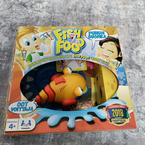 Ihana ja palkittu Fish Food-peli! Puhuvalla kalalla on nälkä – ruoki sitä! Jalustallaan pyörivä suomea puhuva kala antaa sille annetun matokortin haluamalleen pelaajalle. Pelaaja, joka saa ensimmäisenä kerättyä oikeat kortit, voittaa pelin. Vuoden lastenpeli -voittaja 2018! Juuri vaihdetut paristot ( 3 x AAA). Muuten uudenveroinen kunto, mutta korteissa hiukan käytön jälkiä. Sanoisin että kuitenkin niin siisti, että kelpaa vaikka lahjaksi Kalan pyrstössä näköjään vielä suojamuovit :D vaikka paljon tätä on pelattukin, selkeästi hauska peli lasten mielestä. Pelaajamäärä: 2 – 4 pelaajalle. Ikäsuositus: Yli 4-vuotiaille.