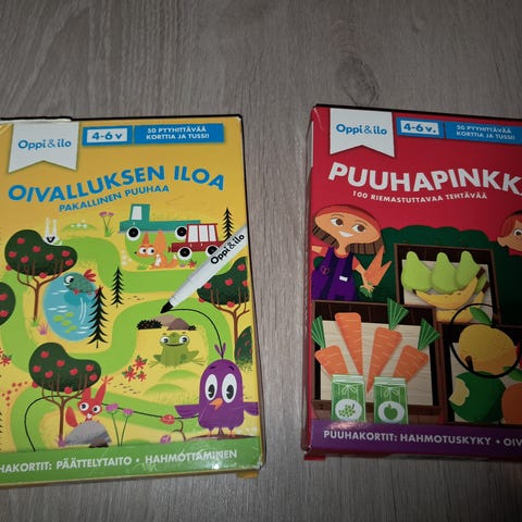 Oppi & Ilo puuhakortit 3-4-vuotiaille. Koko paketti aivan pränikkä, eli mukana pyyhittävä kynä ja täysi paketillinen kortteja, joissa tehtävät molemmilla puolilla.