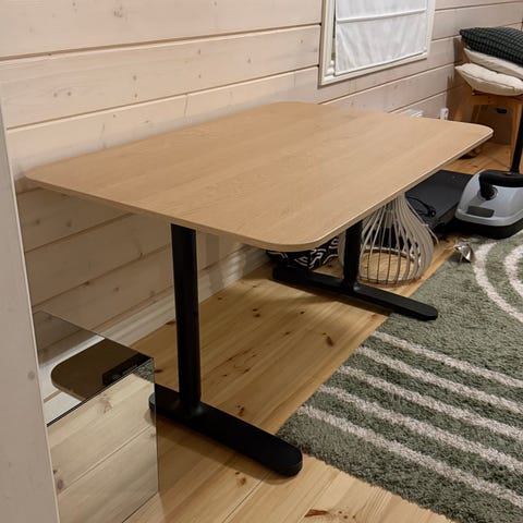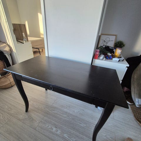 IKEA Työpöytä mustalla värillä. Työpöytä on suunniteltu tarjoamaan työskentelytilaa ja siinä on yksinkertainen muotoilu. Materiaali on kestävä ja helppohoitoinen. Sopii erilaisiin sisustustyyleihin ja käyttötarkoituksiin.