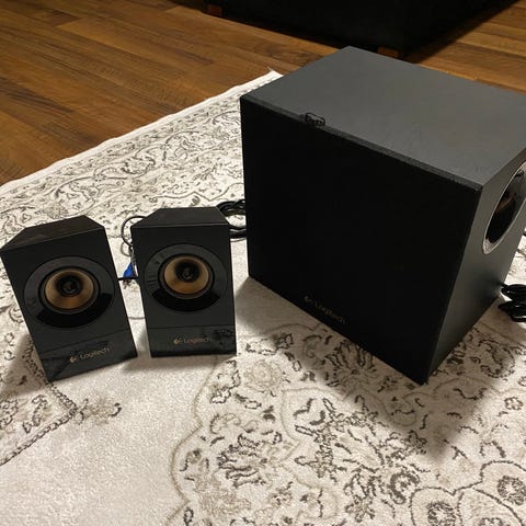 Logitech kaiutinjärjestelmä sisältää kaksi valkoista satelliittikaiutinta ja valkoisen subwooferin. Kaiuttimissa on mustat kaiutinelementit ja säätimet yhdellä kaiuttimella. Järjestelmä on tarkoitettu äänen toistoon esimerkiksi tietokoneen kanssa.