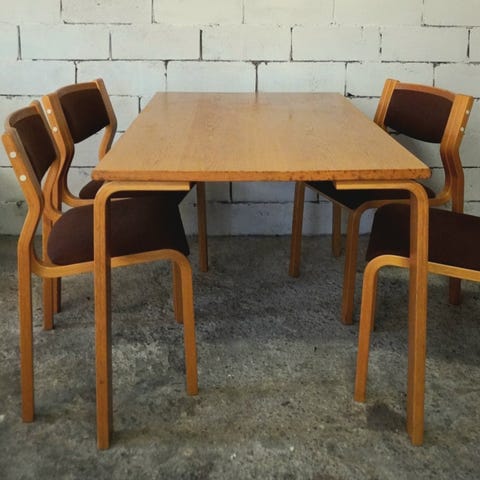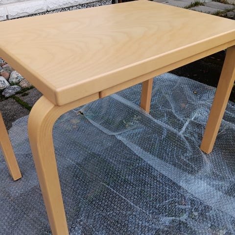 Meille käytettynä ja maalattuna ostettu Artekin 84 pöytä. Mitat 160x160. Pödän alle on lisätty parin cm korotuspalat, jotka saa halutessaan helposti pois.