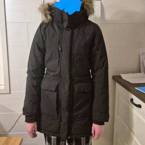 Tyttöjen erittäin hyväkuntoinen musta toppatakki, vaakatikkaus, sivuissa pienet halkiot. Vetoketju ja tarralista, huppu.