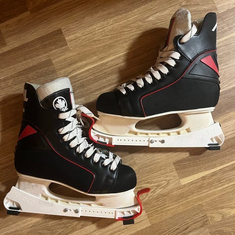 NHL jääkiekko luistimet, koko 42. Luistimissa musta ja punainen väritys, sisävuori on pehmeä ja lämmin. Soveltuvat jääkiekkoon. Huom. Merkinnässä koko 43, mutta vastaa mielestäni enemmänkin kokoa 41.5-42. Pohjallisen putuus 27,5 cm. Toridiili tai nouto Hyvinkäältä ja voi samalla kokeilla.