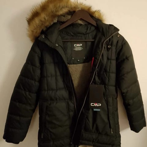 Laadukas, uutena pojalle ostettu AI:n hupullinen talvitakki, jossa kiinni vedettävä ”kärpäshuppu” tuiskuja ja tuulia varten.