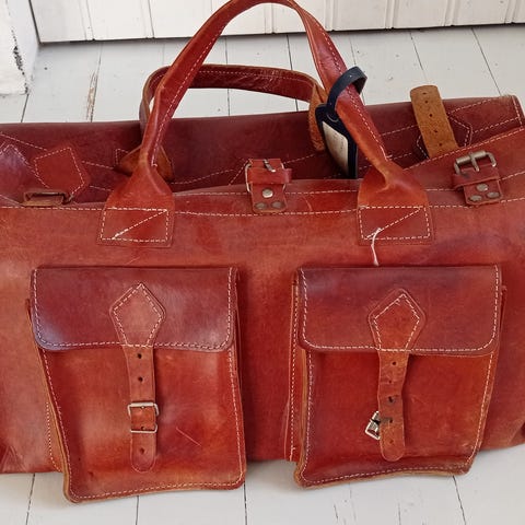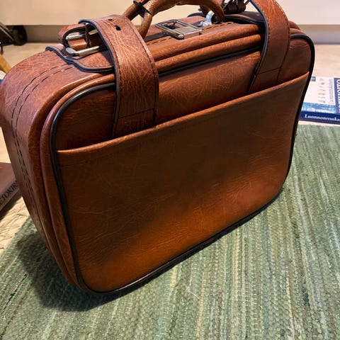 Iso muhkea kapsäkki. Aitoa nahkaa. Lukko kiinnitys. Sisäpuolella pikku tasku, ehjä metallinen vetoketju.