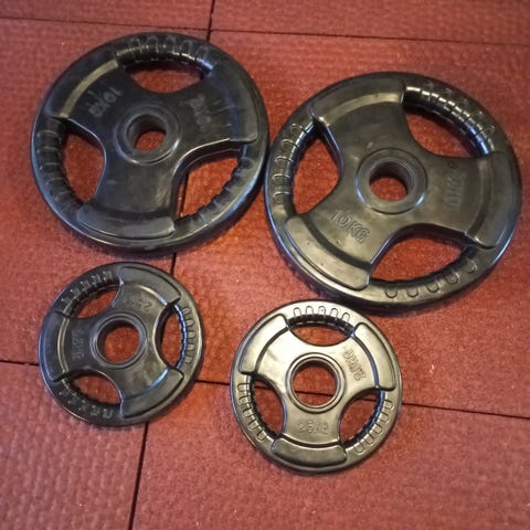 Myydään pakettina. Leoko levypainoteline, 2 kampaa poikki mutta mahtuupahan enemmän. 2x 15kg ja 2x 20kg kumireunaiset. Maalikulumaa mutta kumit täysin ehjät. 20kg levyt punnittu ja molemmat on -10 grammaa.
