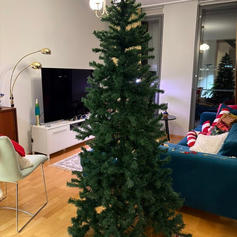 Kuusta avatessa havaittiin, että eihän se tähän kotiin mahdukaan... Nyt olisi siis viime vuonna ostettu tekokuusi lähes koristeluvalmiina noudettavissa, muutamia oksia pitää vielä availla 😊 korkeus 220cm.