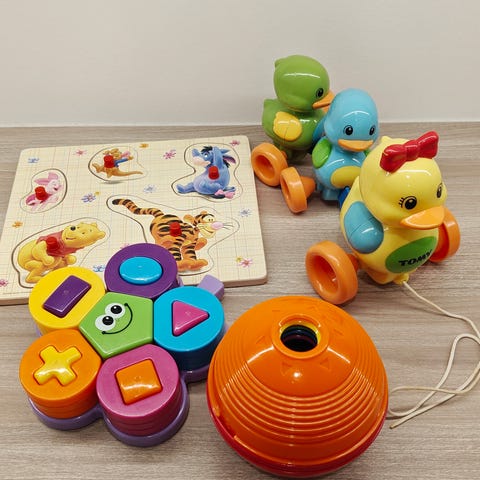 Kuva 2 = 10e. Pinottava lelu, Nalle Puh pehmoja, laukku, autoja, vaunuja, puhelin, Fisher Price Laugh and Learn toukka kirja, helistimiä, puruleluja, jne.